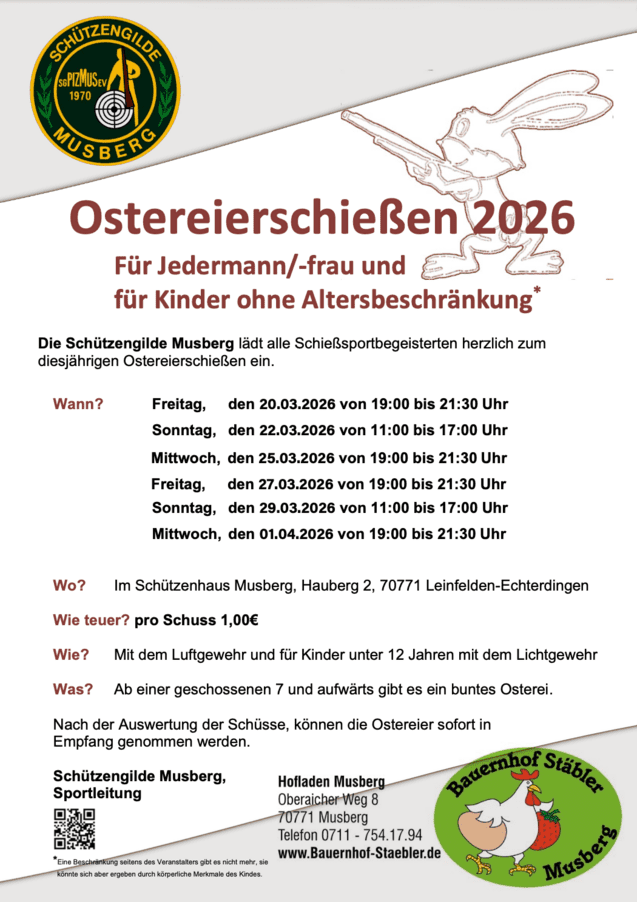 Unsere ordentliche Hauptversammlung findet nächste Woche Freitag (13.3.) um 19:30 Uhr im Schützenhaus Musberg statt. Dazu sind nochmals alle Mitglieder herzlich eingeladen.